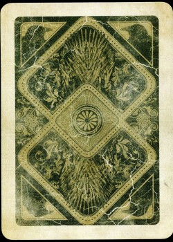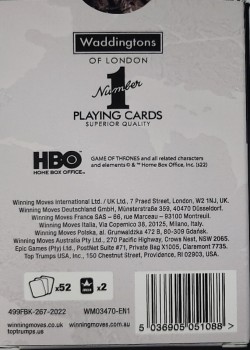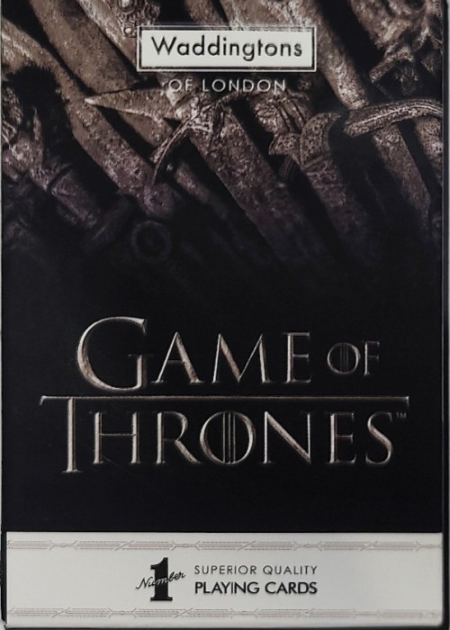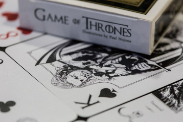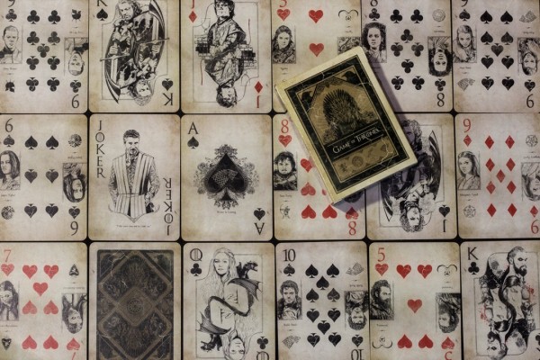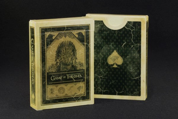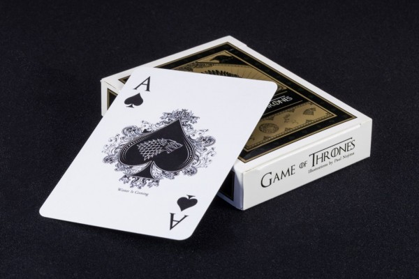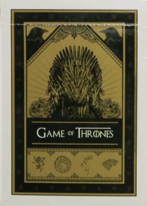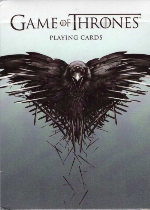 Created by Paul Nojima, sold on Etsy.com, with each of the four suits representing the four main Houses of Westeros: Diamonds: House Lannister Clubs: House Targeryen Hearts: House Baratheon Spades: House Stark Each number-card character has a portrait, name, and (associated) house sigil. This is a full 54-card poker-sized deck of playing cards. Each character is hand drawn and the Aces are the house sigils. The distressing on the vintage edition was done as post-processing before printing to create a deck of cards that actually looks like it came from Westeros. Each deck comes in a custom designed tuck box and the cards are professionally printed on high quality 310gsm card stock with linen finish.