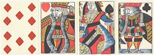 Judging from 18th-century letters and inventories, Colonial Williamsburg's citizens spent a lot of time at the card table. Williamsburg tavern keepers bought as many as six dozen packs at a time from the Printing Office. Playing cards were imported from England and printed on heavy paper with woodblocks. Face cards were handpainted, and the backs were left plain. The Great Mogul cards are based on a deck made by I. Hardy in England 1765. An original resides in a museum at Colonial Williamsburg.