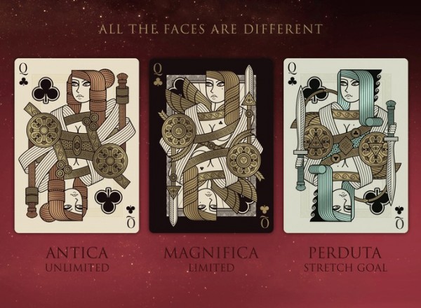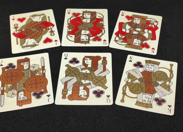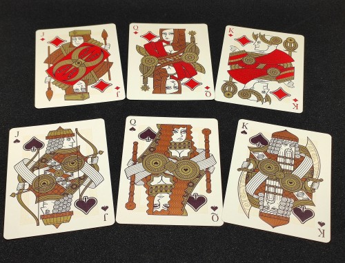 Suits are inspired by ancient civilizations, for example Hearts are inspired by Egyptians. The King is a Pharaoh, and the Jack is a priest of Life. Spades are inspired by Babylonians and Persians. Clubs are inspired by Greeks.The Jack is a Hoplite warrior, and the King is a Philosopher. Pips are elaborate, custom and include metallic inks. All aces are custom, not only the Ace of Spades. There is a winged snake on the AoH. Omnia Antica uses a lot of copper metallic ink, even on the card back border. As always, queens are pretty.