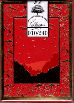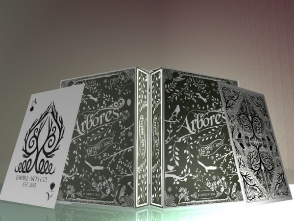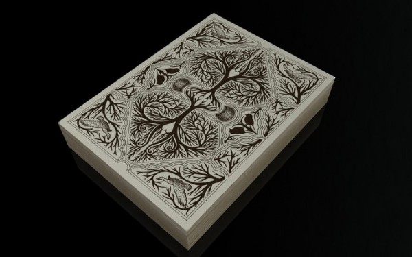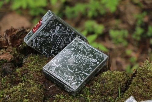 The dark green background brings out the silver ornaments on the tuck case. Only some parts of ornaments will be foiled, including text such as "Arbores", Tuck sides, bottom and also some elements like birds. The fine detail of each hand drawn card is reminiscent of a hard working. Arbores will have a print run of 150 or more. Each deck will be numbered and this deck will never be re-printed.