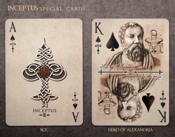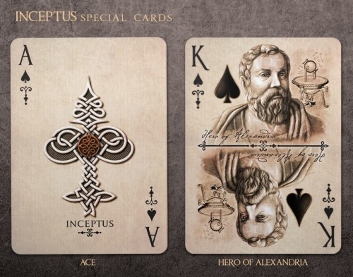 One of 3 decks in the Inception series (Inceptus, Illustratum, Intellectus) of 54 cards each, this KickStarter project was funded by 734 backers pledging $42,479 on May 17, 2016 and delivered in October 2016. For the most part these all contained the same cards with different tuck and back, but in addition each deck had a unique Ace and King of Spades. Each deck as also made available in uncut form, plus dealer coins, shirts and leather case as part of the Deluxe reward. There also was a signature reward that included all 3 decks in a special gold foil designed case with signature cards.