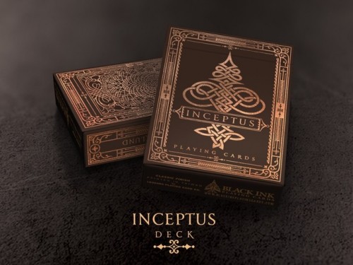 One of 3 decks in the Inception series (Inceptus, Illustratum, Intellectus) of 54 cards each, this KickStarter project was funded by 734 backers pledging $42,479 on May 17, .2016 and delivered in October 2016. For the most part these all contained the same cards with different tuck and back, but in addition each deck had a unique Ace and King of Spades.COMPANY:Black Ink Playing Cards