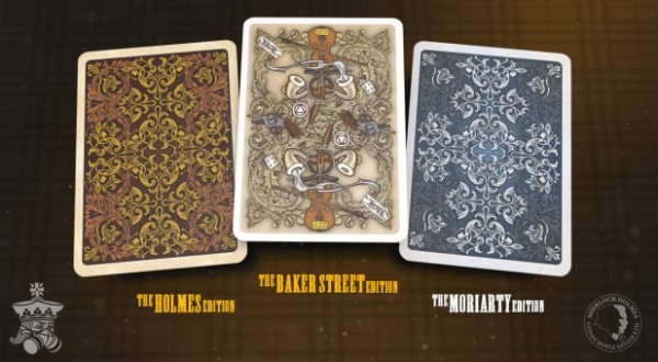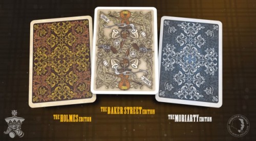 The Moriarty Edition features a simple but elegant tuck case, that features intricate embossing and silver foiling. The Moriarty Edition courts cards are a whimsical stylized rendition of the characters of the Conan Doyle world that still have an element of the traditional court cards we are all accustomed to. The courts designs are the same as the Holmes Edition but with a cold desaturated feel, with elements of grunge and decay, to pay homage to evil villain the take their name sake from. The Moriarty Edition also features Metallic Silver Ink in the place of metallic red.