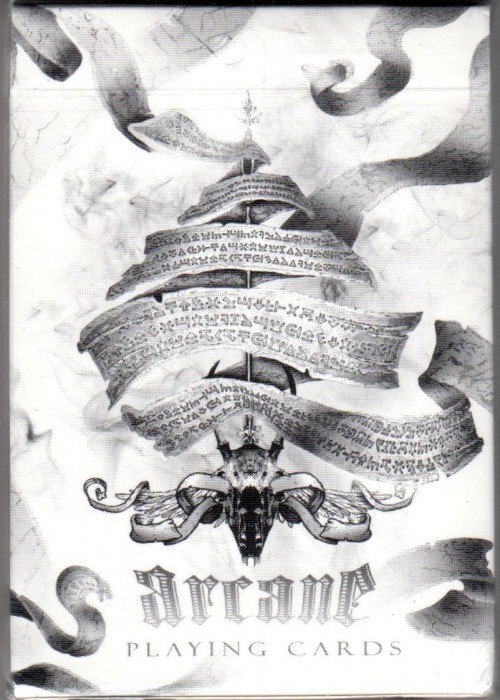 View all cards here: https://cardscans.piwigo.com/index?/category/542-white_arcane\nManufactured by USPCC, this unbranded deck reportedly was in development for 5 years with 3 designers working together before Ellusionist released it in 2009 as the first in their new line of signature playing cards. This is the white version of the Arcane deck, but there was also a black version, as well as a rare red and gold ones (variations of the black). The deck was designed for magic and cardistry use by the use of the unique back design and custom jokers plus gaff card, in addition to standard game play. Many may consider the unique jokers the most interesting component from a collector perspective. The courts feature variations of standard courts with modified outfits and smokey/faded look. The tuck also claims to feature the first use of a wraparound design. Per playingcards.wikidot.com, they are printed on \\\\\\\"Aurora\\\\\\\"" stock