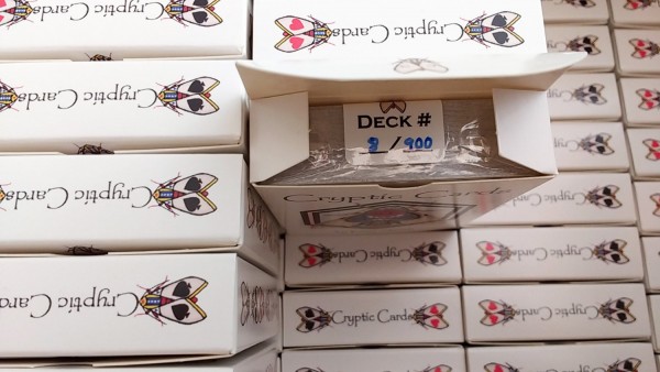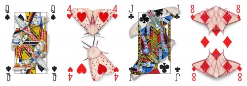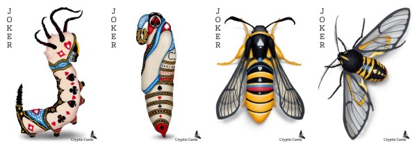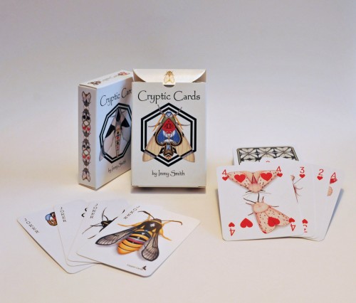 Cryptic Cards is a sciart project paying homage to the amazing cryptic camouflage found in moths. Every card face in this deck of poker size cards has a detailed & intricate design, and each was hand-painted by me, to camouflage imaginary moths onto each card. Decks were litho printed by Cartamundi UK. Each deck includes 52 cards of the four suits, and 4 jokers, making up a 56-card deck, which comes in a custom designed tuck box. Decks are numbered with a special sticker on the cellophane wrapping, just under the tuck flap