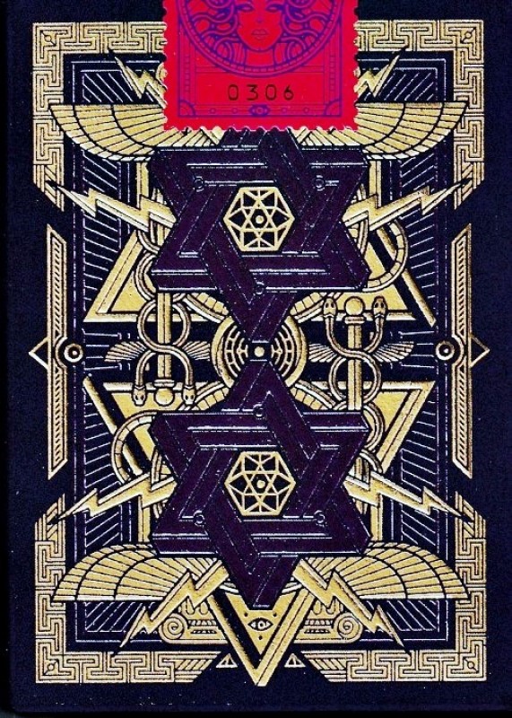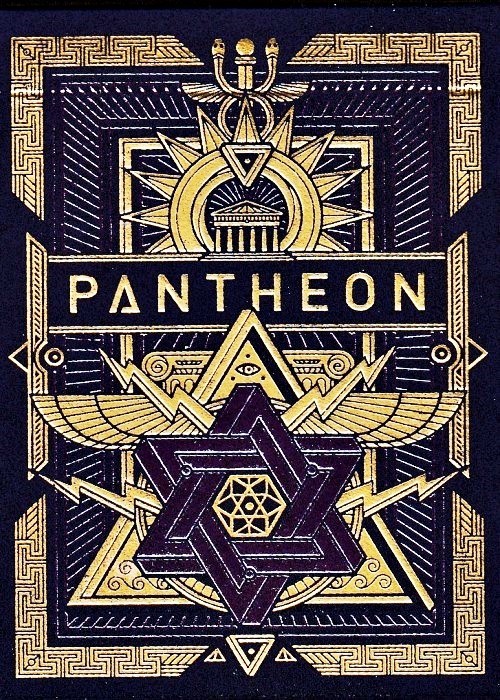 Custom poker size playing cards. Inspired by mythology, drawn with a sharp and modern style, printed by EPCC with foil on backs. Pantheon is a limited deck from Thirdway Industries, with a luxurious tuck box and gold foil on card backs. I consider it a spin off of Dedalo, and all the court cards are Greek Gods. Tuck box Features: Dark matte paper Embossing Double foil outside, Gold and Violet Red inner foil Numbered custom seal (1-1777) Card Features: 2 Metallic inks on faces, bright gold and bright violet Fully custom: courts, aces, back, box - everything redesigned Gold foil on the backs Limited - 1777 / around 1500 available through Kickstarter NEW - 55 cards (extra joker included)COMPANY:Thirdway Industries