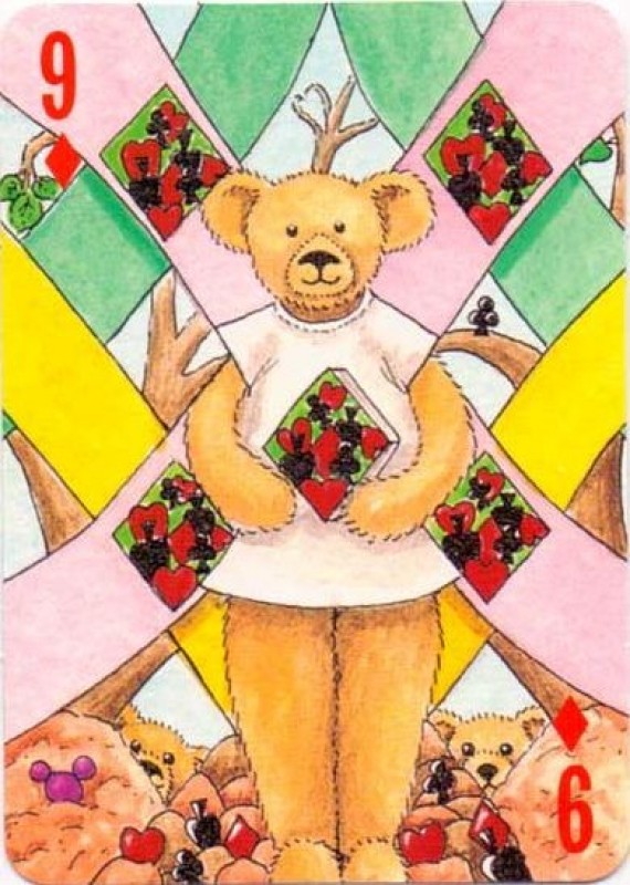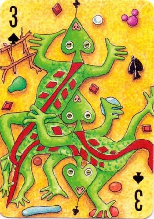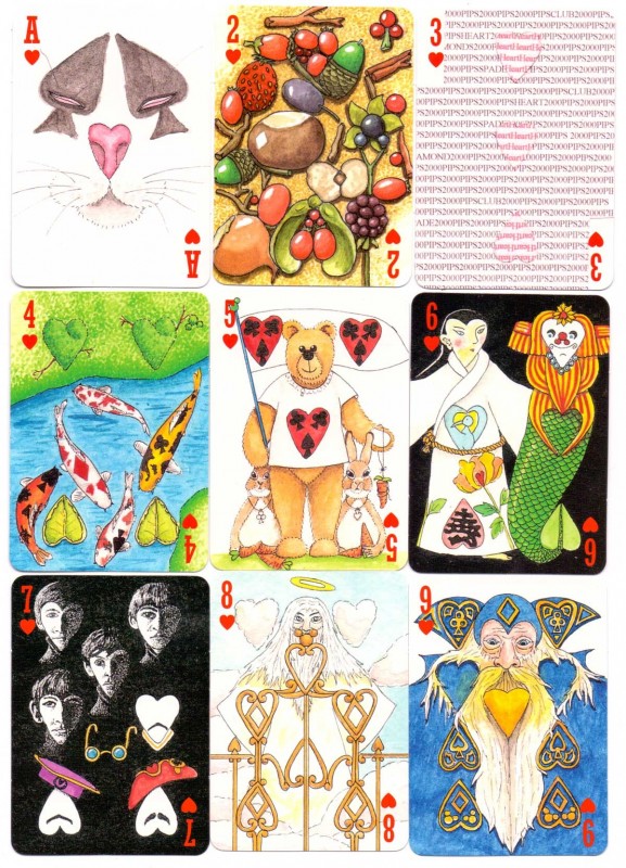 Peter Wood’s “2000Pips” Transformation pack of playing cards (1999) comes in an edition limited to just 1000 packs worldwide. All the pips are cleverly transformed into a vibrantly colourful picture, different on each card, providing endless fascination to the beholder. We see his love of the natural world, particularly the insects, flowers and garden objects, fruits and animals, with almost scientific observation of their minute details.