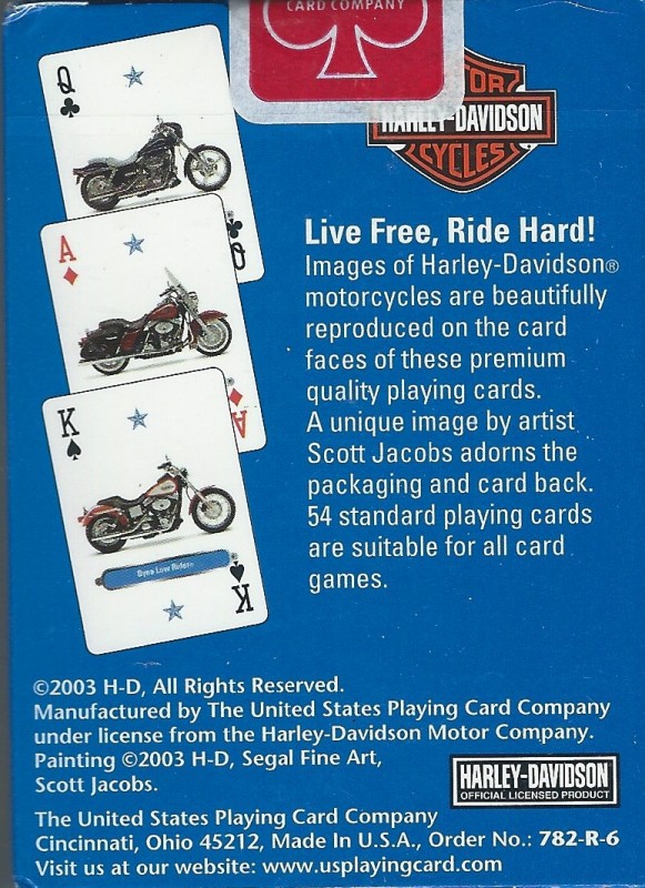 Red deck of a two deck set with collectors tin. "Live Free, Ride Hard? Images of Harley Davidson motorcycles are beautifully reproduced on teh card faces of these premium quality playing cards. A unique image by artist Scott Jacobs adorns the packaging and card back. 54 standard playing cards are suitable of all card games."