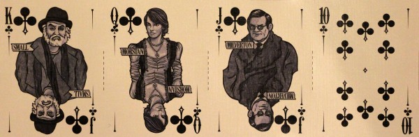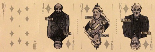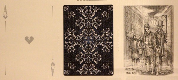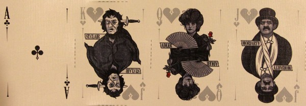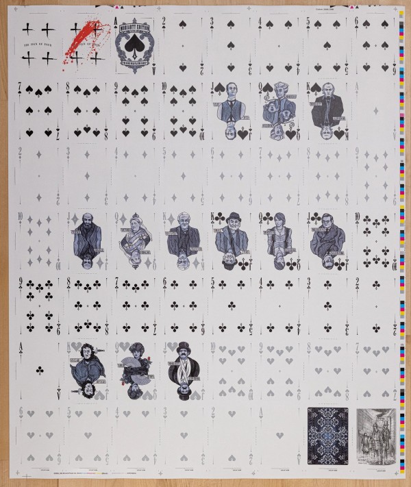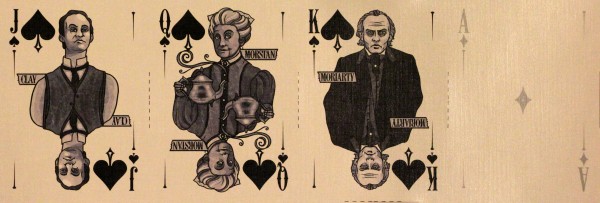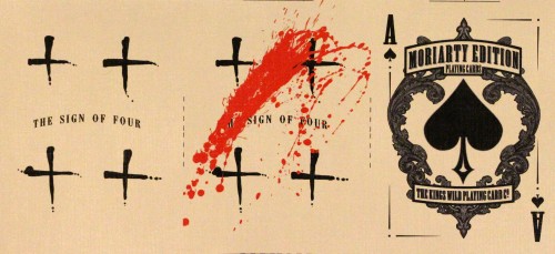 The evil sister deck of the Holmes Edition, the Moriarty deck features a full cast of villains and damsels in distress as queens. The Moriarty Edition is the only deck in the Sherlock Holmes series that features metallic silver ink instead of red for the hearts and diamond suites.