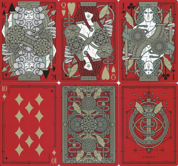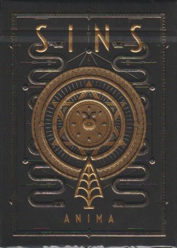 Symbology about the backs and the decks The backs of SINS represents Eden, the place where the first Sin happened. In SINS Mentis, Eve was planning to eat the Apple of Knowledge, but she didn't actually do that - so Eden was bright. In SINS Corpus, Eve ate the Apple and she was banned. Without her and Adam, an eternal night fell on Eden. This means, chronologically, that SINS Corpus happened after SINS Mentis. In SINS Anima, Adam and Eve realized they're the first two humans in the world. They are banned, frail and mortal. But after they ate the Apple, they also are full of self-knowledge. They became the first two dreamers. Eden is now empty and is red. Red like blood and hell fire - but also red like the heart, passion and life. The three decks also represents the philosophy behind the name Thirdway Industries: thesis, antithesis, synthesis.