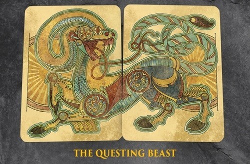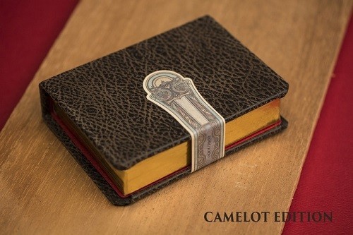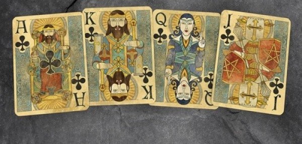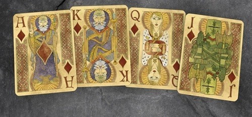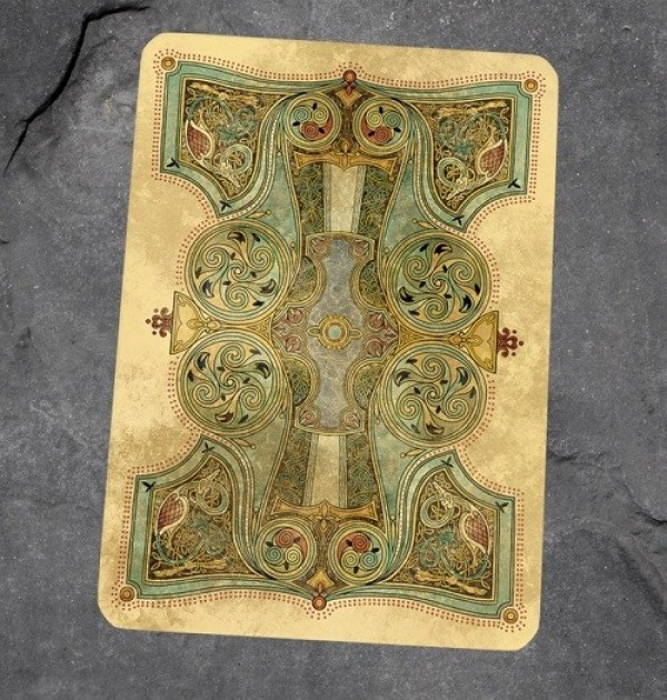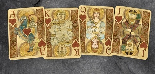 The art for this deck is a reflection of the Book of Kells. The Book of Kells is a beautiful hand drawn and written illuminated manuscript that tells the story of the four Gospels of the Bible. This book was written around the same time as the origins of the King Arthur story. This legend and art style are a perfect compliment to each other. In the Camelot Edition, each suit will have its own unique suite Celtic knot border. Other notable differences will be much more elaborate aces and a unique dyptich joker.COMPANY:Kings Wild Project