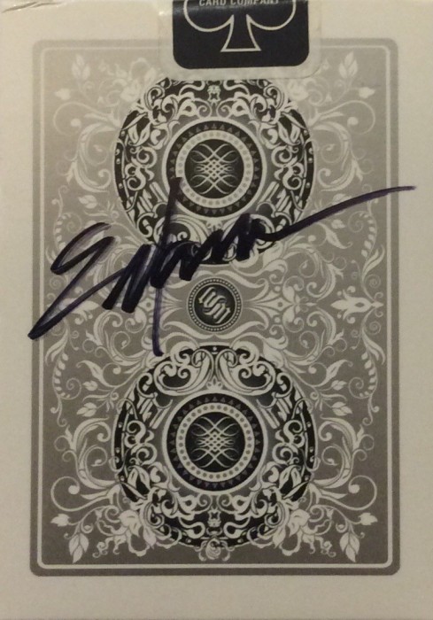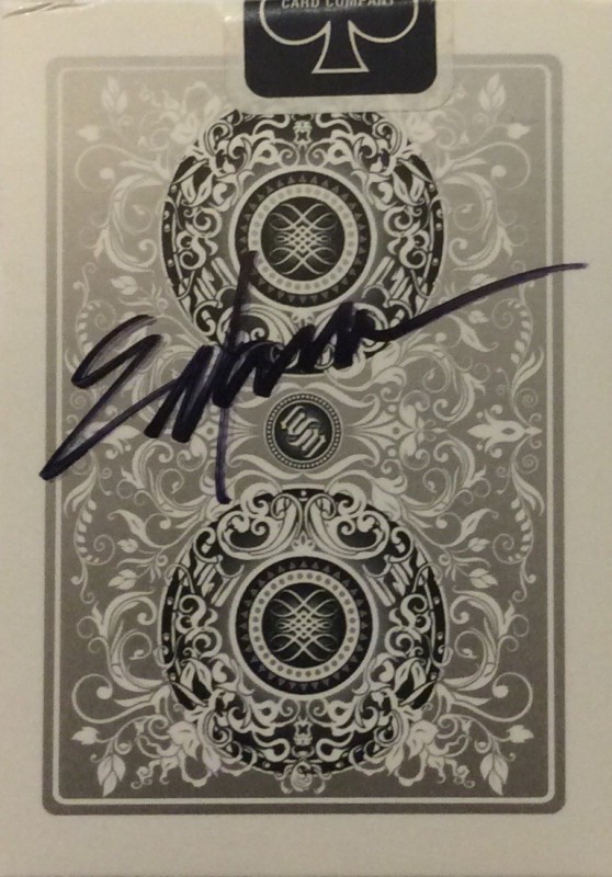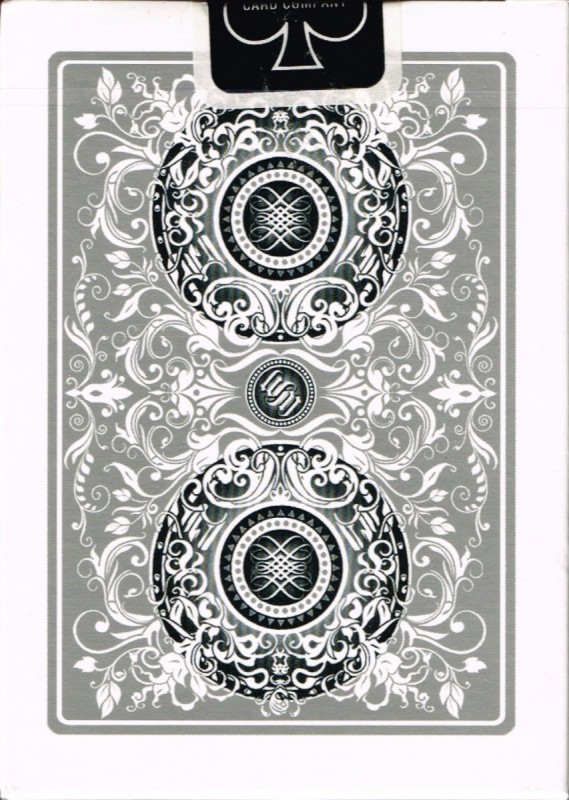 The deck was printed by USPCC, on 325 card stock with their usual "Magic Finish", which is preferred by many for the smooth fans and flourishes it enables. It has the usual modern cut (back to face) used by USPCC, which Erik prefers because "it allows for beautiful straight dribbles, perfect single hand faros and table faros, not to mention more accurate riffles, pinky counts and thumb counts." The finish and handling was exactly what was hoped for, with the deck fanning smoothly and evening, and the stock being crisp and yet springing well.