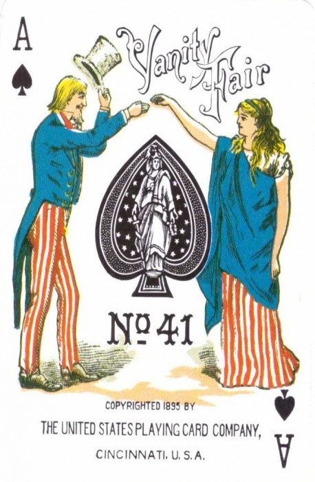 A replica/facsimile deck of the 1895 USPCC Vanity Fair deck created by the Museum of Fournier de Naipes which is a playing card museum located in Vitoria, Spain. It originated as a private collection in 1916 by Félix Alfaro Fournier, the grandson of the founder of Naipes Heraclio Fournier. Unlike the original deck which was poker size, this deck was printed in bridge size. The actual print date is not known and likely has undergone multiple reprints as needed, but is believed to be 2010 +/- 5 years for most decks.