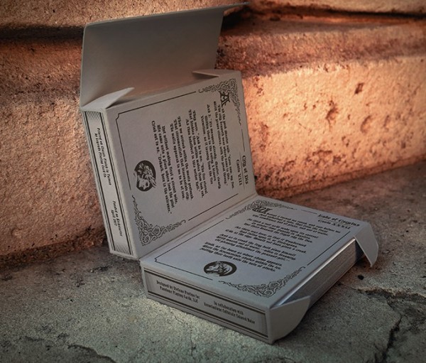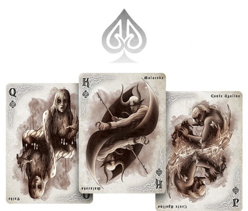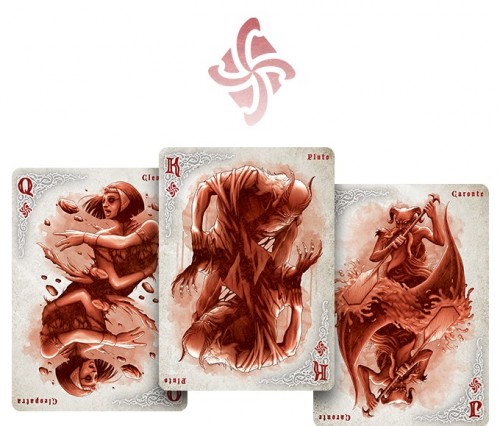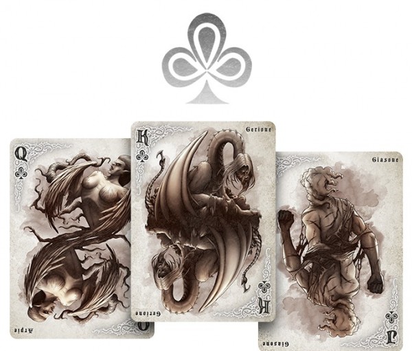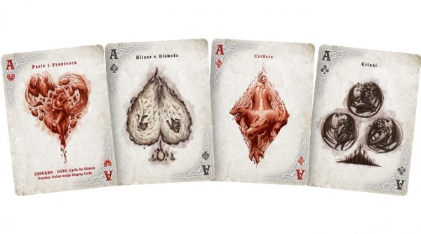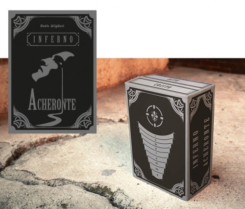Inferno Acheronte is a novelty created specifically for this project: a double tuck case, that opens like a book and holds respectively, Inferno Dite and Inferno Cocito, The tuck case will be manufactured in Italy by Archivio Tipografico, numbered (250 copies) and signed by the Author: Stefano Protino. Both decks inside are limited edition versions. Dante, following ancient myths, states in the “Divina Commedia” that all of the rivers and waters in hell stem from the tears of an old man’s statue in Greece. Inside the “open book” you’ll find the words used by Dante Alighieri to describe the city of Dis (Dite) and the lake of Cocyto (Cocito).