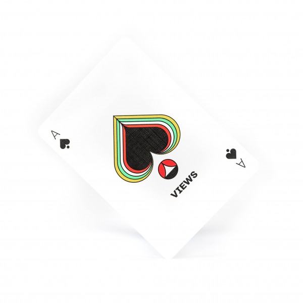 The cards are designed from scratch and 100% custom. The back design features the motion-like bending VIEWS dots with a mint undertone to create the illusion. The face cards have custom pips, and the courts have Pantone metallic inks.