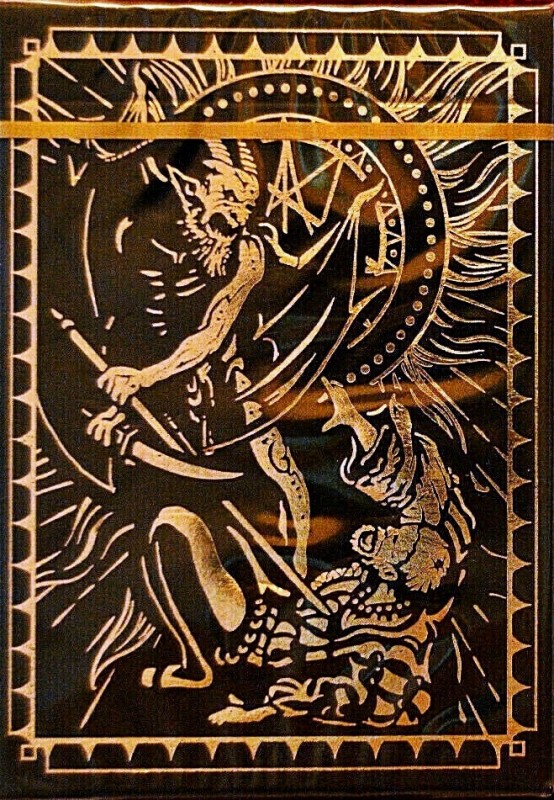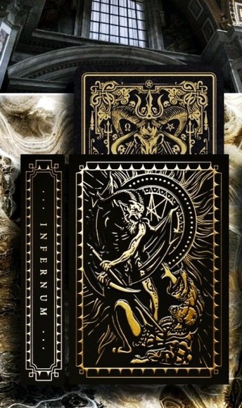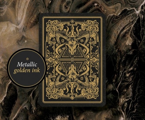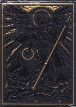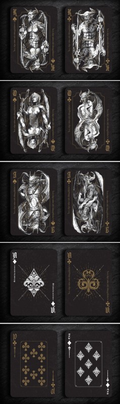 Inspired by eschatological literature of the postexilic period, Culminus form the third and final volume in my Light versus Darkness series of deluxe, dark art poker playing cards. Culminus aims to represent ultimate evil and ultimate good with two standalone deck designs, Infernum and Infiniti, where infernal devils are seeking to wreak havoc to neutral men, and ethereal guardians are trying to stop them. In its essence, Culminus symbolises the moral compass and ethic dilemmas that all monarchs have faced in history and time as saints and sinners. Tuck features embossing and gold foil with numbered seals with metallic ink with gold pigment on card fronts & backs.