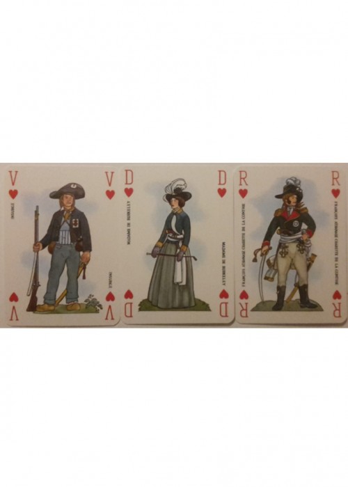 Guerre de Vendee decks come in two versions: Les Blancs and Les Bleus. The two decks depict two armies fighting over Vendee region in France between 1793-1801. Les Blancs depicts French monarchists and Les Bleus depicts French republicans. Both decks have their own set of courts, jokers and aces and were printed by Grimaud in 1982.