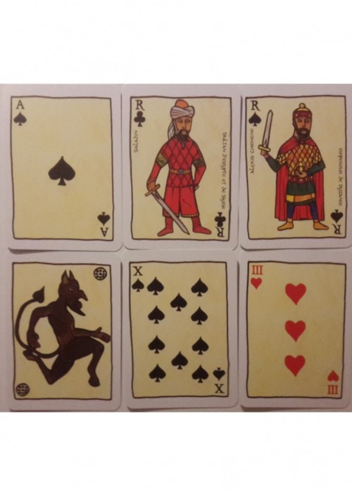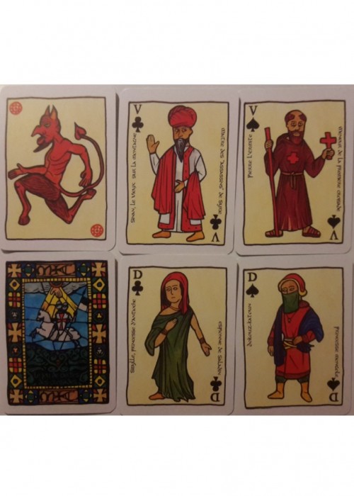 This Grimaud deck was printed in 1996 and depicts historical people during European crusades on Jerusalem, such as Saladin and Sibylle.