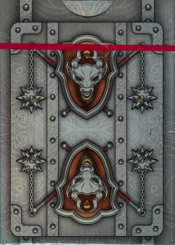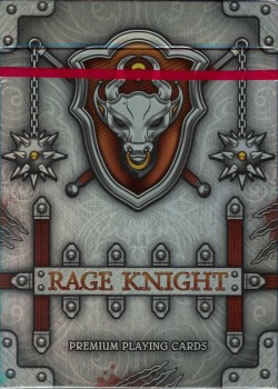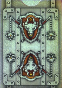 The designs for the Knights Tucks incorporate a Chainmail background for the Fury, and an Etched Armour background for the Rage. The Fury Deck features a green accented shield and a Stag Head for his crest. The Rage Deck features an amber accented shield and a Bull Head for his crest. Each design includes its Knight's preferred style of weaponry - Battle Mace for the Rage Knight, Medieval Axe for the Fury Knight (sorry fellow GOT fans, no Ice-Tipped Spear). For a closer look, here's a couple links to the Rage Knight and Fury Knight Tuck flats.