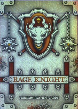 The Rage Knight Back Card features an Etched Armour background and a head-to-head layout of the Rage Knight's shield, Bull Head crest and Battle Mace. The Face Cards for the Rage Deck have a metal texture with grey full-bleed coloring. The PIPS have a silver metallic look, and are inlaid with Rivets. The Spades and Clubs have large center areas with green coloring. The Hearts and Diamonds have large center areas with amber coloring. The green and amber color variances help with reading between the suits and overall playability. Similar to the Fury Deck, I used an older Courts Set for the Jacks, Queens and Kings. More images of the Rage Knight Cards can be found at the bottom of this project page (including the Jokers).
