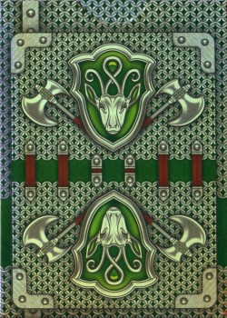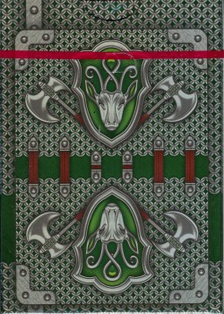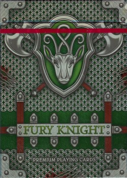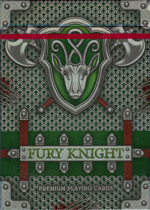 The designs for the Knights Tucks incorporate a Chainmail background for the Fury, and an Etched Armour background for the Rage. The Fury Deck features a green accented shield and a Stag Head for his crest. The Rage Deck features an amber accented shield and a Bull Head for his crest. Each design includes its Knight's preferred style of weaponry - Battle Mace for the Rage Knight, Medieval Axe for the Fury Knight (sorry fellow GOT fans, no Ice-Tipped Spear). For a closer look, here's a couple links to the Rage Knight and Fury Knight Tuck flats.