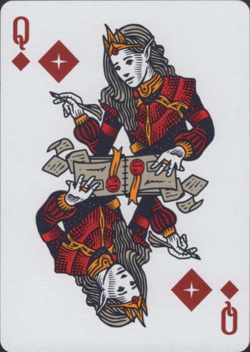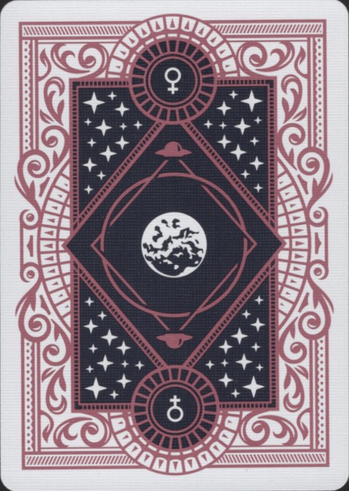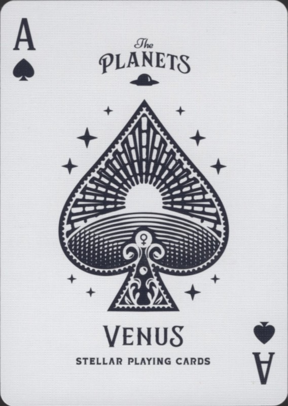 The Planets is a collection of decks representing the planets in our solar system, starting closest to the sun and moving outwards into the surrounding universe. The second deck of this series is Venus, featuring an all-female court. The tuckboxes are printed by Clove St. Press, producers of gorgeous letterpress printing. The decks will be printed by the United States Playing Card Company (USPC), makers of Bicycle & Bee brand decks and supplier to casinos around the world.
