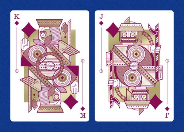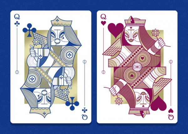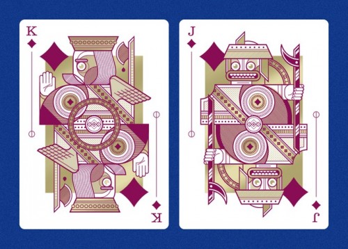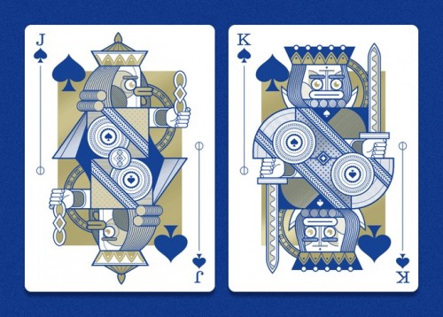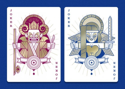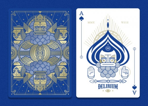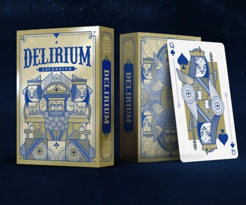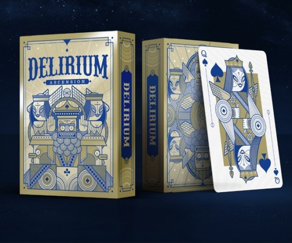 Delirium Ascension was the mystery deck of the 2014 KS campaign and was not revealed until now. Ascension has a lot of metallic inks, both on the cards and the tuck box. The dark blue, light blue and different shades of gold are all metallic. I've already used USPCC metallic inks in my Eva deck and they turned out awesome. The card backs are full bleed and printed with metallic inks.