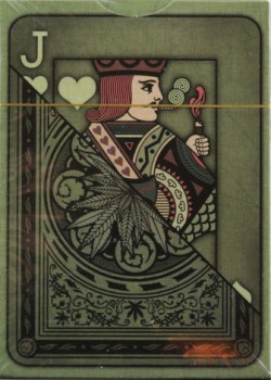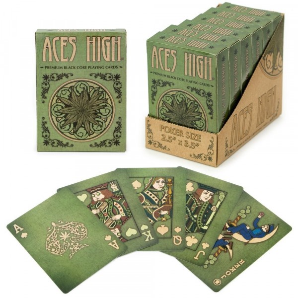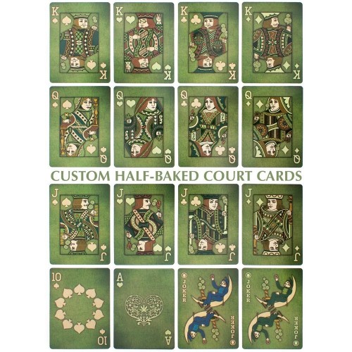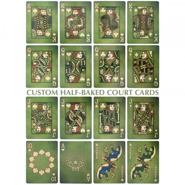 Custom from the ground up, Aces High is our love letter to the devil's lettuce. Each classy, grassy green playing card is a visual feast, from the ornate Victorian-Deco cardbacks to the 12 unique face cards and radial pips. We'll be blunt: this deck isn't just a gag gift. Printed on thick, premium 310gsm Black Core card stock and finished with a plastic coating for protection and longevity, these cards play as good as they look.