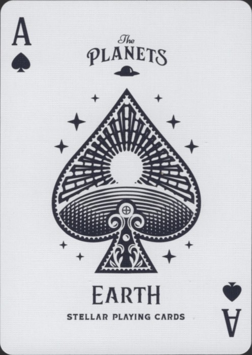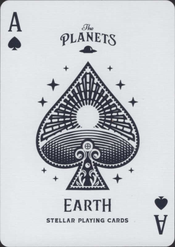 The Planets is a collection of decks representing the planets in our solar system, starting closest to the sun and moving outwards into the surrounding universe. The third deck of this series is Earth, featuring our version of standard human courts. The tuckboxes are printed by Clove St. Press, producers of gorgeous letterpress printing. The decks will be printed by the United States Playing Card Company (USPC), makers of Bicycle & Bee brand decks and supplier to casinos around the world.