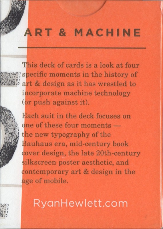 Each suit in the deck focuses on one of these four moments in art history - the new typography of the Bauhaus (♠) era, mid-century (♥) book cover design, the late 20th-century (♣) silkscreen poster aesthetic, and the contemporary (♦) art & design in the age of mobile.