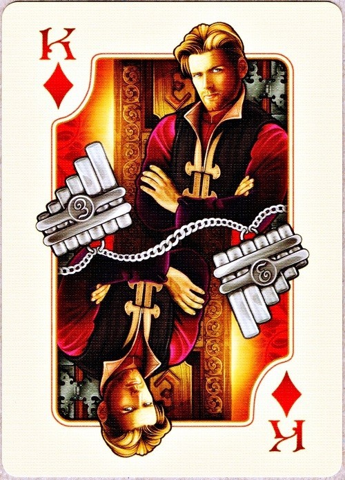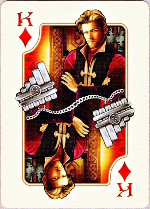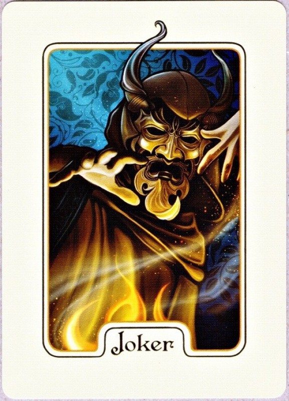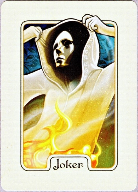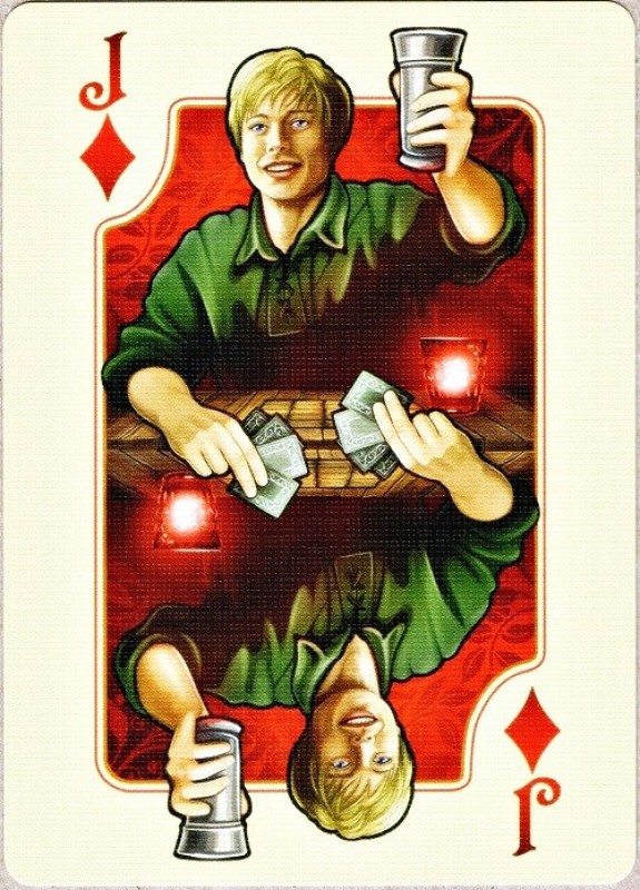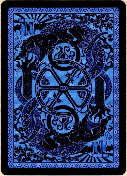 A playing card deck with beautiful illustrations by Echo Chernik featuring characters from Patrick Rothfuss's The Name of the Wind. There were two main editions: the standard red and gold foil art deck, and the black and blue foil Chandrian deck. Each edition had two versions: Wind and Selas (a type of rose).