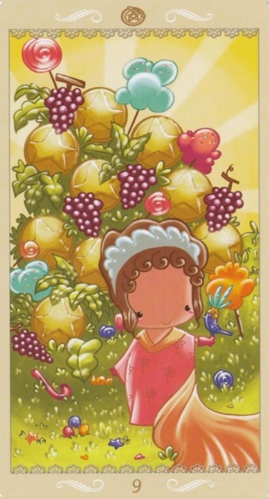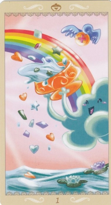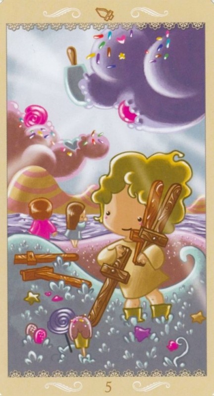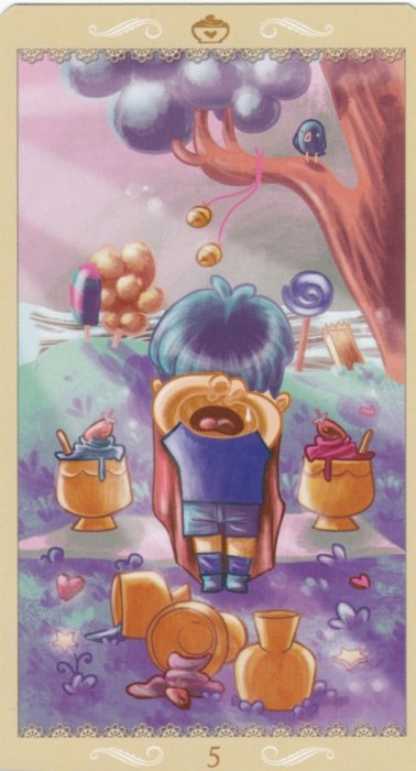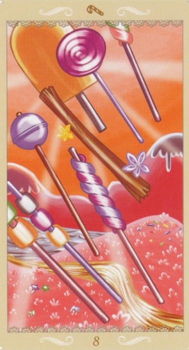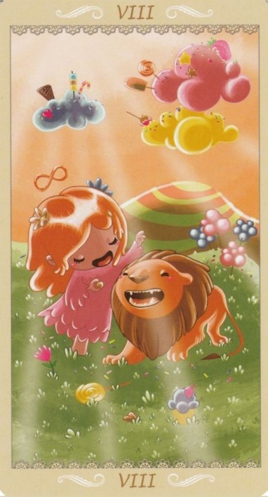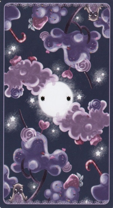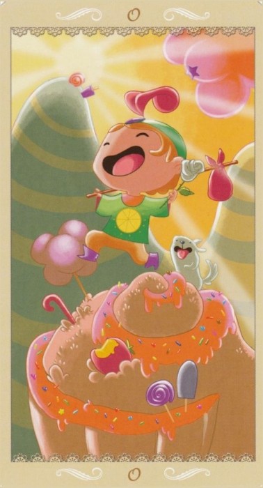 The world of the Happy Tarot is gently humorous with with great attention paid to charming details. The countryside in which the inhabitants reside is a mouthwatering confection of children's sweets and favourite desserts. Mountains are topped with sweet sauces and giant cherries, a confetti of sprinkles, candy, lollipops, and ice creams and frozen treats lie on the ground; fairy floss trees and flowers made from boiled sweets sprout in gardens and rural scenes.