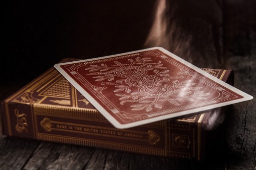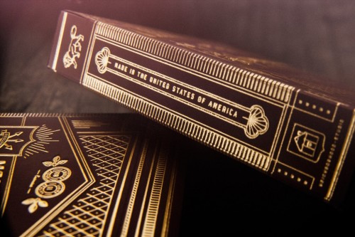 Clear thread around tuck box, as opposed to the gold thread on the v2. On right side of tuck it reads "U.S. Playing Card Company". Original Theory11 circle logo on bottom of box.