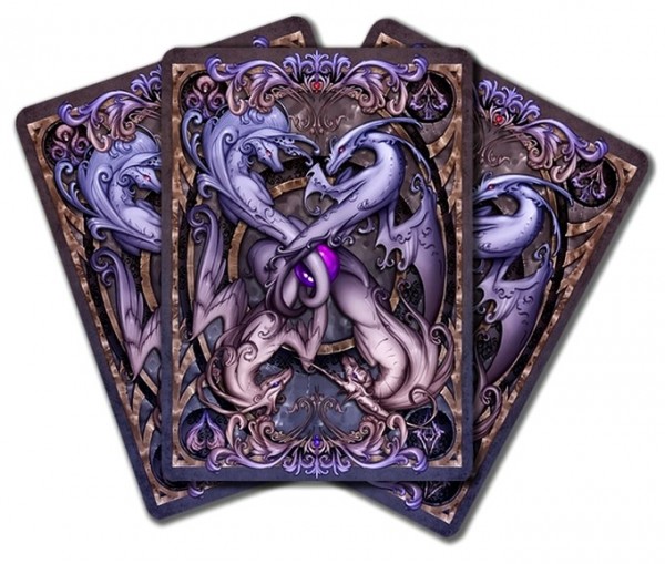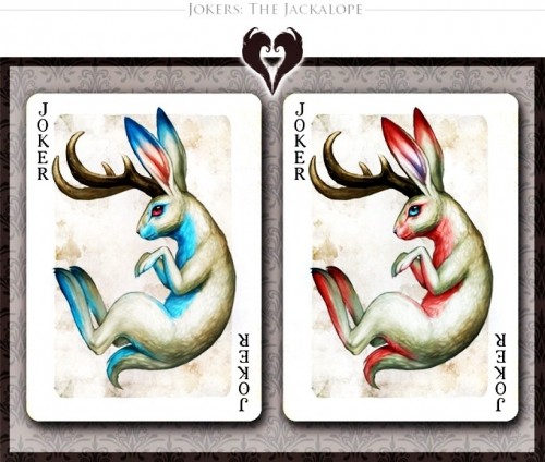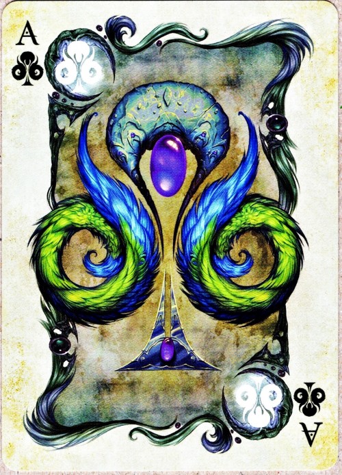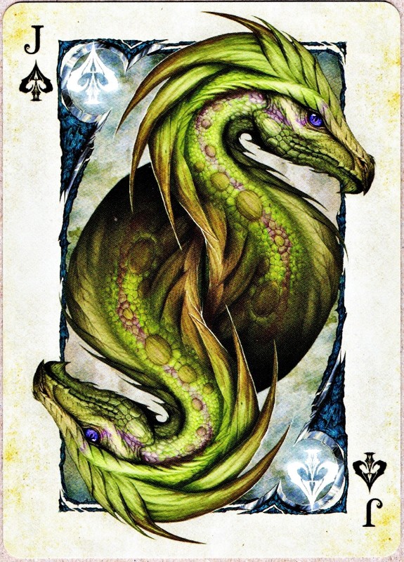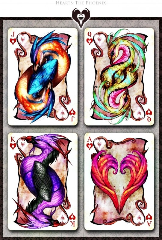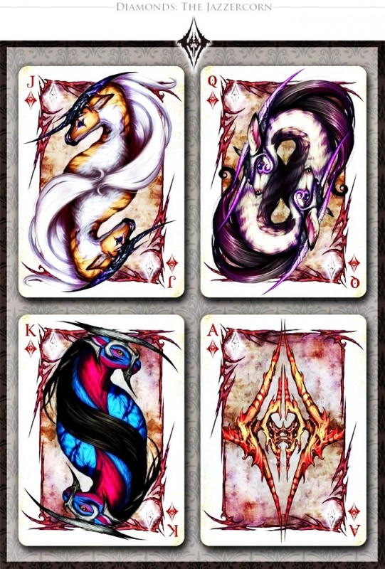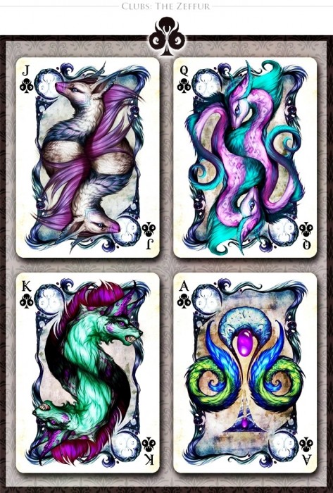 Savage Majesty is an intricately and lovingly painted playing card deck by the artist Leslie Casilli. Inspired by creatures of high fantasy, it features four fantastical races; the Dragons, Zeffurs, Pheonix, and Jazzercorn, each of which represent one of the four suits. The intention of the project was to create a deck which featured colorful and intensely detailed designs that focused on unique creature creation yet stayed true to traditional playing card composition. A defined inner border allows the cards to be able to be read quickly and accurately. The inverted heads stay true to traditional card design. Custom pips make the deck feel unique and exciting, yet are easily recognizable. https://www.kickstarter.com/projects/426623920/savage-majesty-the-playing-card-deckCOMPANY:Legends Playing Card Company