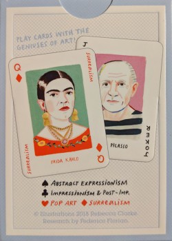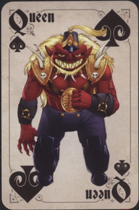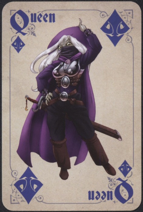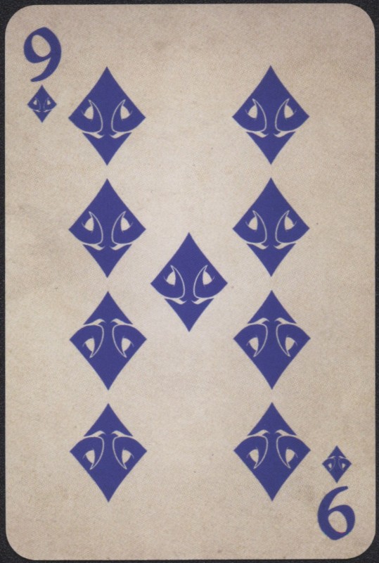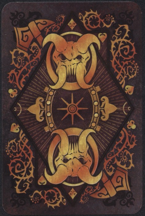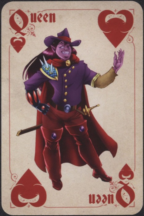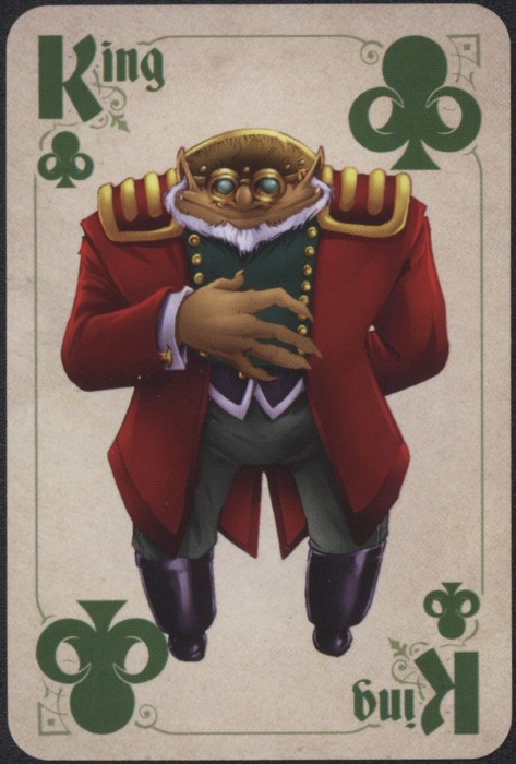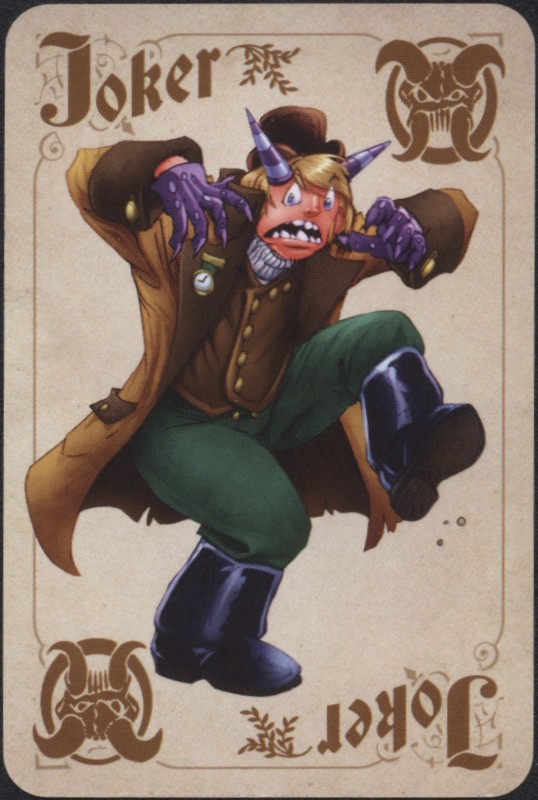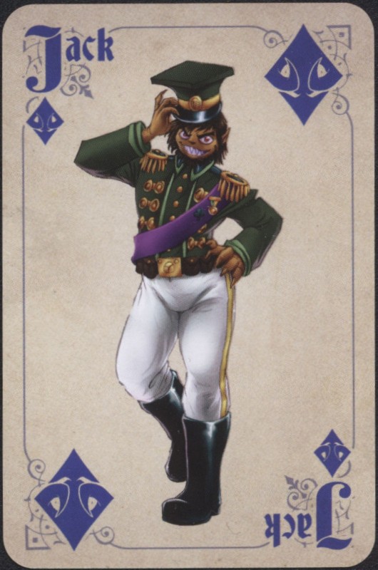 This deck features many of the Jagermonster characters from the Girl Genius comic. The deck has custom pips that are colored differently from a normal deck of cards. The Aces and Court cards feature various characters.