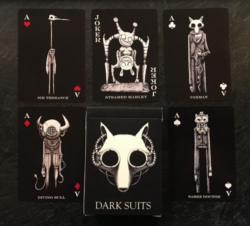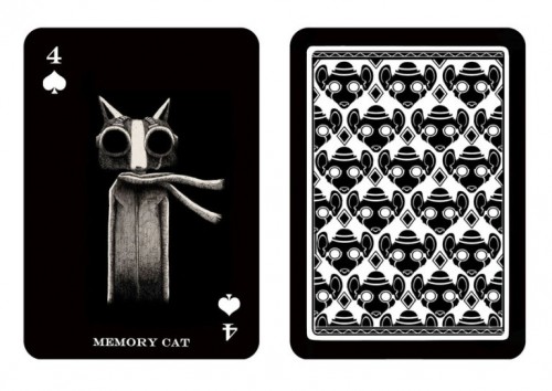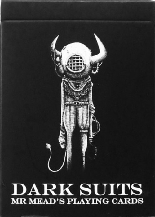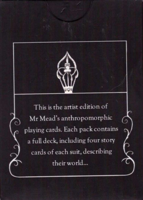 This deck features weirdly wonderful bio-mechanical anthropomorphic creatures from English artist Mr. Mead who channeled his childhood fear and obsession with anthropomorphism. The characters are grouped by family into the four suits, Birds for the Hearts, Horned Beasts the Diamonds, Cats the Spades and Foxes the Clubs. A total of 4 versions were printed in 6 runs of 100 each. Each version uses the same cards, but a different tuck for each version. Initially released in April 2011 as v1 with 100 decks using a tuckbox featuring a rat head and Antlers Gallery 'A' logo on the back, as they were sold by antlersgallery.com only or at the gallery reception event. Shortly after a 2nd version was printed using the Diving Bull (AoD) on the tuckbox with 100 more decks. This was followed by another 100 printing as v3 using the Voxman (AoC) on the tuckbox. Finally the v4 in 3 print runs of 100 each using the foxhead logo, also known as the 'artist edition'.