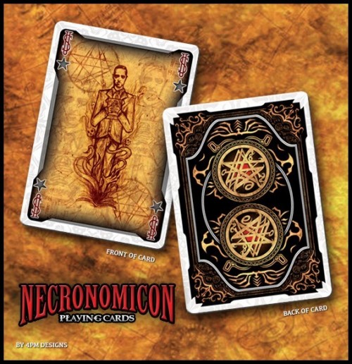 The NECRONOMICON, roughly translated, The Book of the Dead. Forged from the mind of H.P. Lovecraft and just a piece in a series of literature known as the MYTHOS. 4PM DESIGNS has delved into the darkness for a unique deck design. While among the dead, this deck has resurrected the Great Old Ones and their knowledge has possessed these 56 cards to bring you MYTHOS: NECRONOMICON.