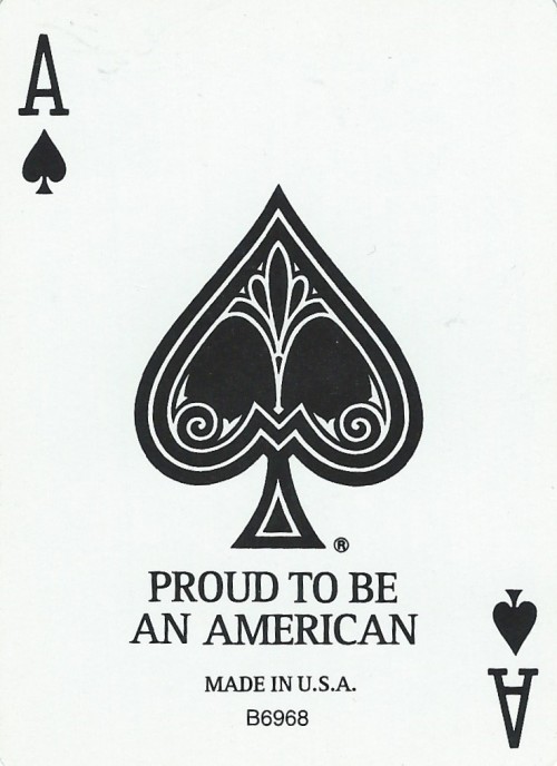 Poker 359 by United States Playing Card Company, 1993, Cincinnati, Ohio. Card back has "Proud to be an American" printed on back. Custom Ace of Spades, standard faces.