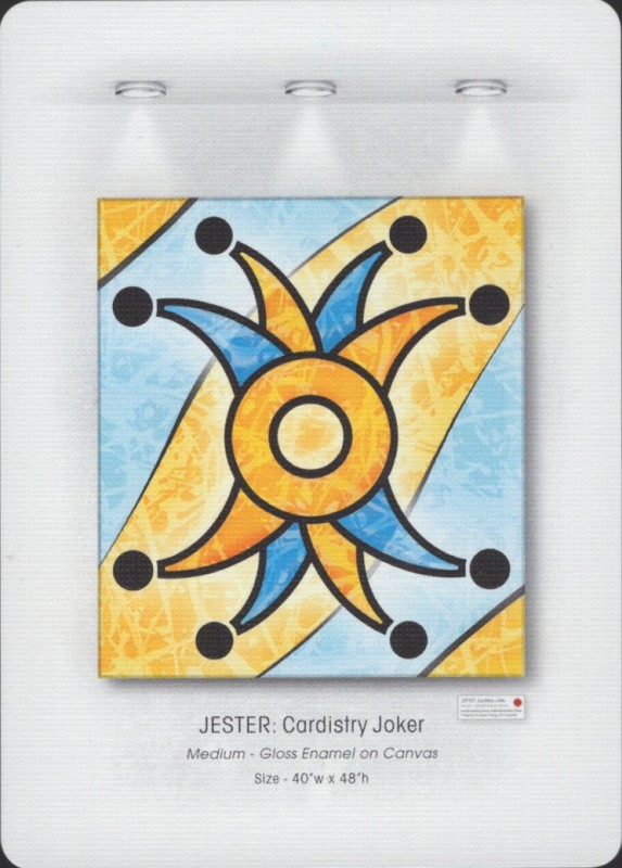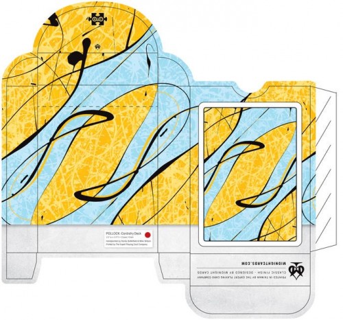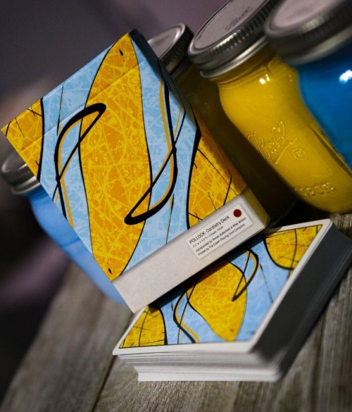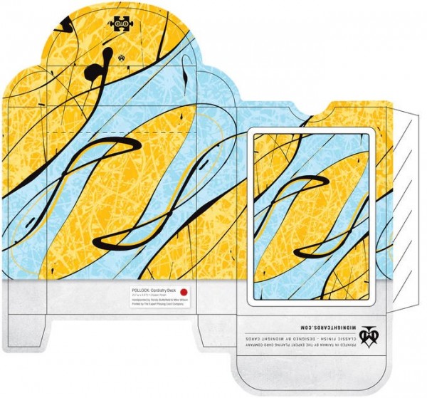 The POLLOCK: Cardistry Tuck Box is printed on a premium Matte Tuck material and features a clear UV Spot Ink overlay that adds a level of gloss in strategic locations. The designs for the Tuck are meant to mimic the look of a Painting displayed in an Art Gallery. The descriptor card and red dot adds to the Gallery vibe. For many Art Galleries around the world, a red dot indicates that a Painting has been SOLD!