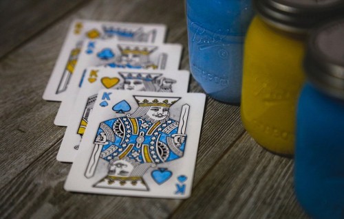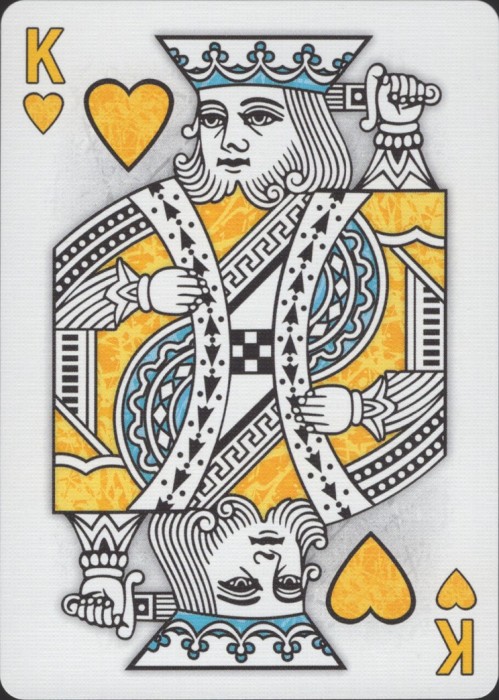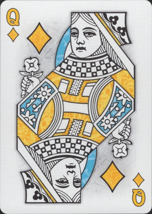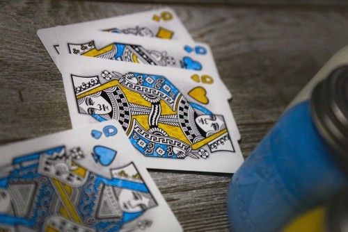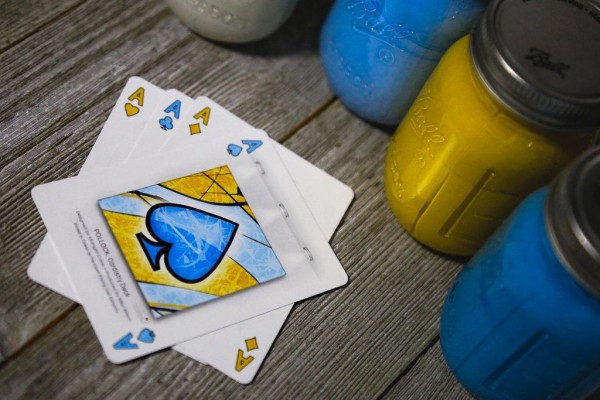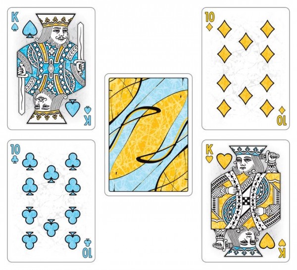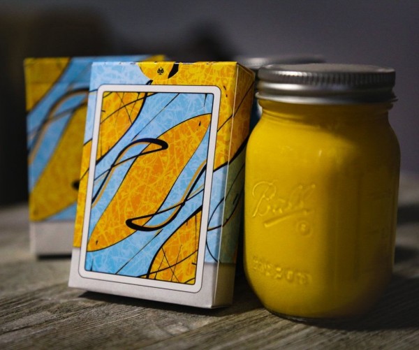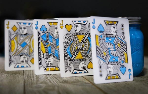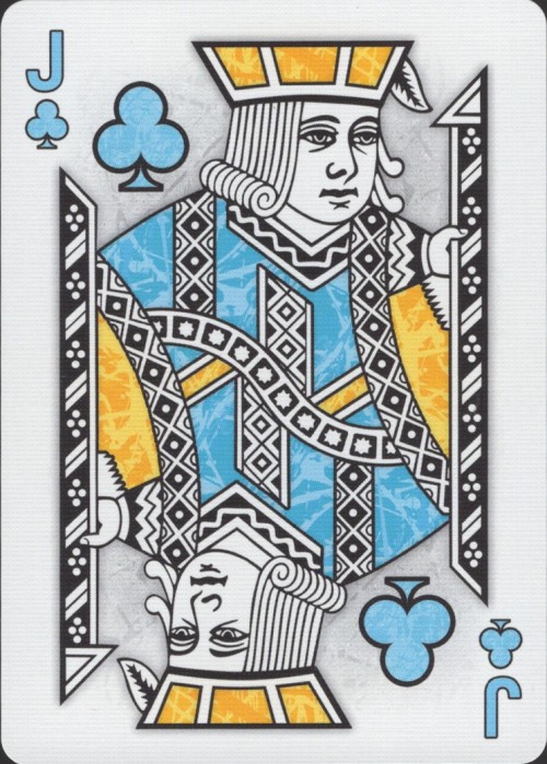 The Back Card for the POLLOCK: Cardistry Deck is an intricate composite of our splatter artwork, made to look simplified with the large color areas. The yellow and light blue colors are accented by rich black design elements. The Ace of Spade and Jokers, like the Tuck Box, mimic a Painting in a Gallery setting. The semi-custom Face Cards incorporate various color combos of the splatter painting composite and create a cohesive look for the rest of the Deck.
