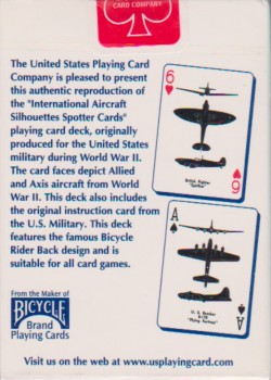 During World War II, USPC provided spotter cards, which illustrated the characteristic shapes of tanks, ships and aircraft from the more powerful countries. Each suit is dedicated to planes from four of the primary countries: Spades - US, Diamonds - Germany, Clubs - Japan, Hearts - Great Britain. The airplane edition continues to be the more popular deck as there are a number of facsimile decks still being produced today from a number of companies. Unlike similar decks created for other military countries in Britain and elsewhere which were simple flashcards without playing card elements, these decks made by USPCC doubled as standard playing cards and were made available to both the military and the public. In fact, the USPCC even took out ads in magazines for them, including the 1943 ad from Collier\'s (see related scanned image). In addition, the US government established a network of civilian airplane spotters whose duty it was to lookout for any possible repeat of the Pearl Harbor attack, with numbers in this Army Air Forces Ground Observer Corps reaching about 1,500,000 volunteers, With that many members of the public involved, it becomes obvious the appeal this deck had and still does have. This PCDB entry is for the original deck released in the 1940s by USPCC. Facsimile decks have their own related entries.