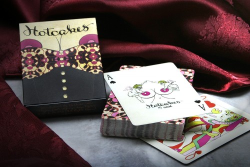 Hotcakes is a whimsical deck of playing cards inspired by the burlesque genre. The burlesque characters on each playing card appear as though they have been beautifully hand-drawn, giving this deck a quirky air of playfulness. The designs are printed on cardstock that looks vintage and dated, further adding to the theme of the age-old art of burlesque.
