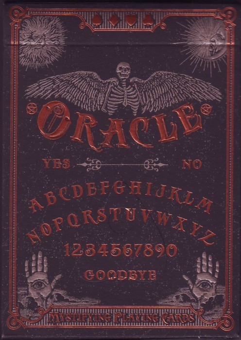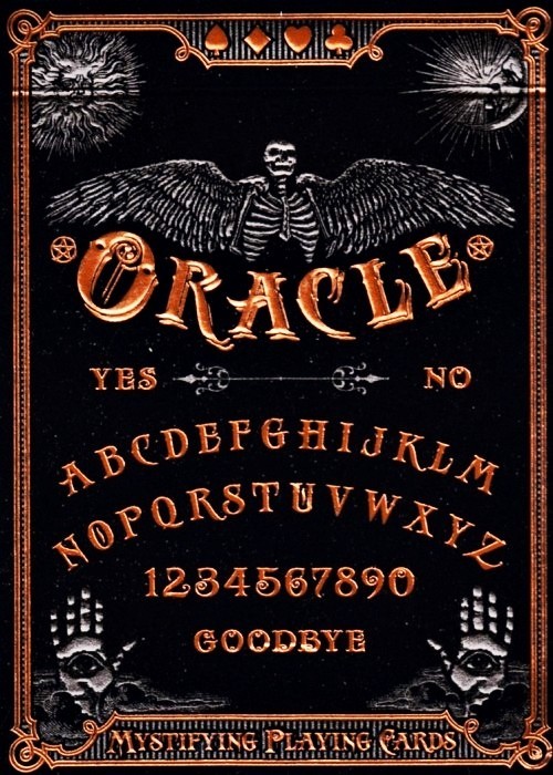 based on talking boards and the Spiritualism movement, these playing cards are unparalleled in finish and art. Employing an engraved style and featuring foil finishes and embossing, Oracle Playing cards were printed by the United States Playing Card Company.
