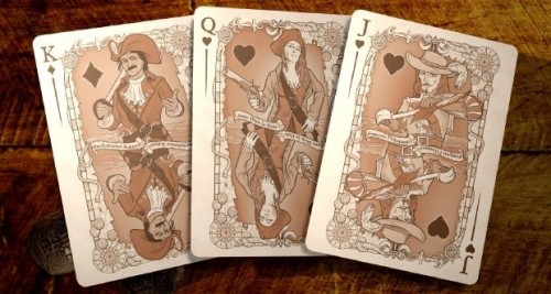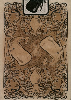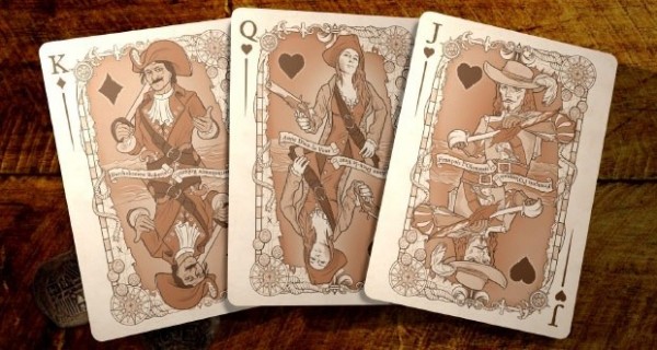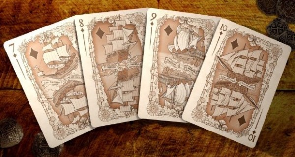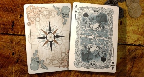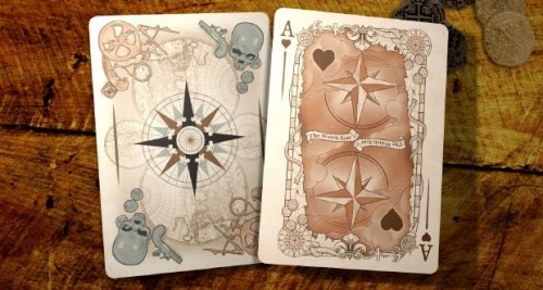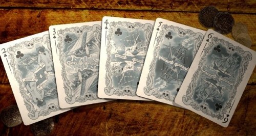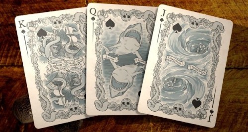 The deck is about the dichotomy of a life at sea. The Red side of the deck; hearts and diamonds; explores famous sailors, explorers, pirates, and privateers of the age of sail. The court cards focus on the actual historical figures of the time and the cards ranked 2-10 of the hearts and diamonds feature different types of ships. The dark side of the deck explores the dangers sailors would face; be them real or fantasy. Court cards for the spades and clubs explore the monstrous creatures thought to lurk below the waves, while the ranked 2-10 cards focus more on superstitions and ghost ships.COMPANY:Brain Vessel