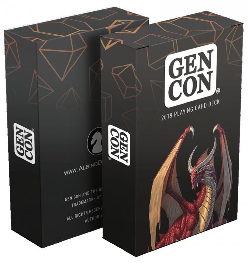 Officially licensed playing cards that were released at GenCon 2019. Limited to those sold during the convention, with the exception of those sold after on Albino Dragon's website (https://albinodragon.com/product/gencon-2019-playing-cards/). Includes 2 jokers (featuring the GenCon dragon mascot, Genevieve), an ad card for Albino Dragon, and a blank card with the deck's back design on the other side.