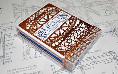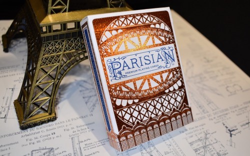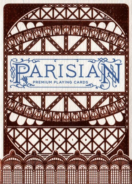 The Parisian Tuck Box features a textured matte paper stock, a rich Copper FOIL, and a PANTONE Blue accent color. The design includes architectural elements featured in the Eiffel Tower’s structure. The letters “ML19” on the front commemorate the Magic Live 2019 release of the Parisian Deck.