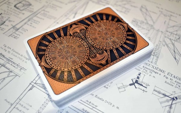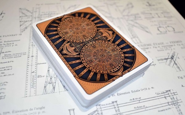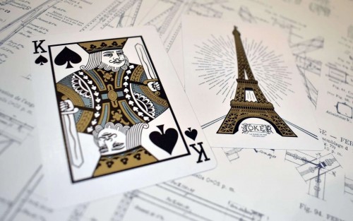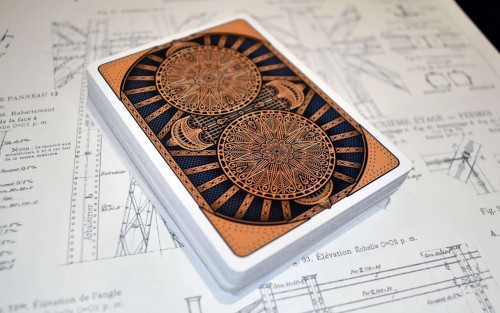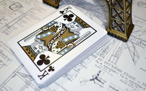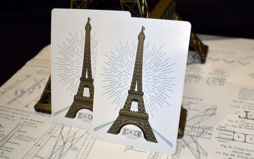 The Cards are printed with Expert’s Classic Finish. The Back Card has an intricate design, bold and rich colors, and contains subtle depth to it. The Marking System is very subtle to casual observers, but easy to read by those who know it’s markings. The Face Cards feature METALLIC Gold and a METALLIC Light Blue inks. The Ace of Spade is elegant and classical. The non-matching Jokers (Gold / Gold and Gold / Light Blue) feature the Eiffel Tower, or “La Dame de Fer”, as it looked upon it’s completion for the 1889 World’s Fair.