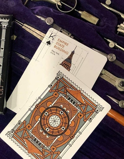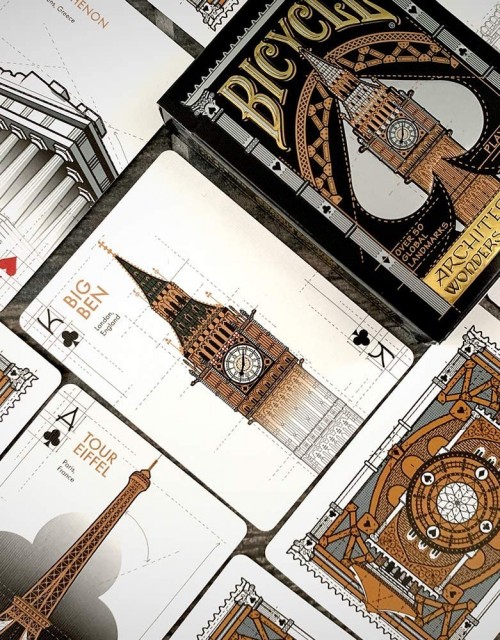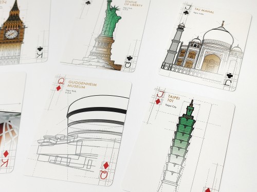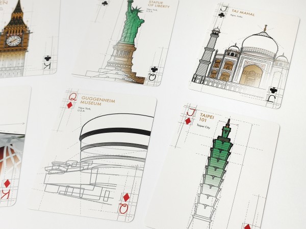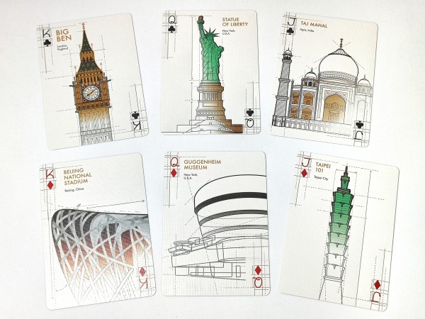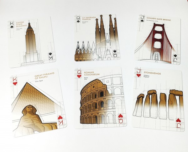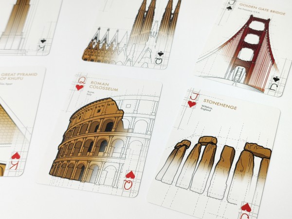 54 hand illustrated architectural marvels from across the globe, custom Ace of Spades and unique card back design.