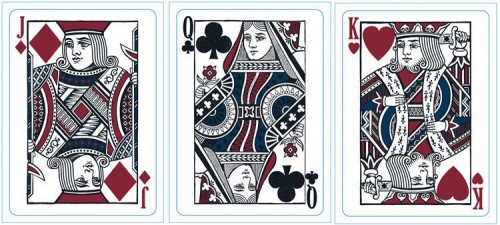 This deck will feature the new set of Kings Wild Standard Vintage Courts. This court set was originally developed for the Tigers but I have evolved it even further from the courts used in the Standard Tigers deck to what you see below. This is the same court set featured in the Thoroughbreds deck, but it will have a Red, White, and Blue color theme in the Americana.