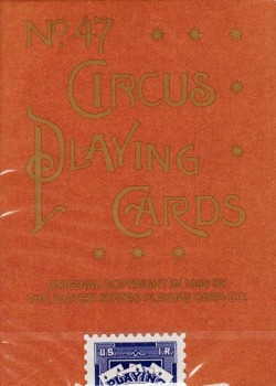 First printed in 1896. The original No. 47 Circus Playing Cards advertising copy said: “The staid old Kings, Queens and Jacks have given way to various well-known ring masters, clowns and queens.”